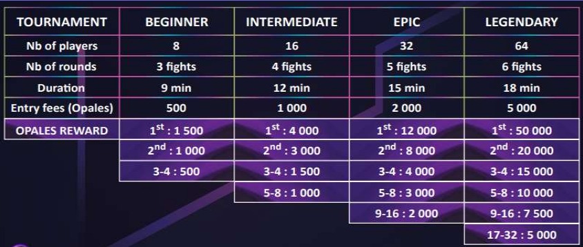 En Alpha, quatre tournois seront disponibles en permanence. Le tableau ci-dessous reprend l’intégralité des informations comme le nombre de joueurs par tournois, le nombre de combats à réaliser au maximum, la durée du Tournois et les frais de participations sans oublier le nombre d’Opales distribué en fonction du classement.